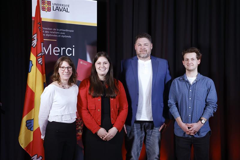 Sur la photo (de gauche à droite) : Nancy Gélinas, doyenne de la Faculté de foresterie, de géographie et de géomatique ; Marilou Cotton-Chouinard, récipiendaire de la bourse de l’innovation Cansel ; David Laflamme, directeur des solutions stratégiques chez Cansel ; et Mathias Hébert, récipiendaire de la bourse commerciale Cansel. Crédit photo : Yan Doublet